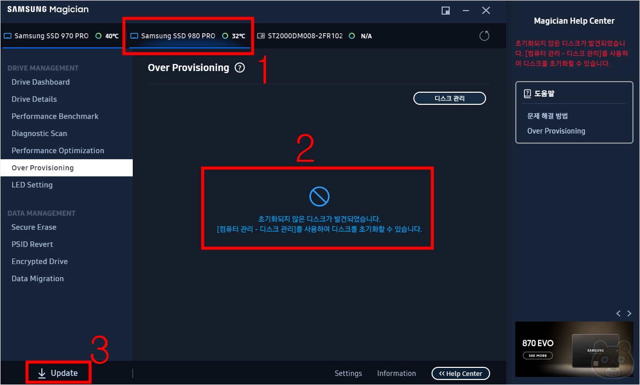 이제 삼성 매지션을 실행합니다. 드디어 제대로 인식하고 있습니다. 두번째 탭인 1번에 Samsung SSD 980 PRO라고 네이밍이 보입니다. 눌러보니 2번에 아직 초기화되지 않은 디스크라고 표시되고 있습니다. 정상입니다. 파티션이 없는 공장 출고 상태니까요. 이제 3번의 Update 버튼을 누릅니다.