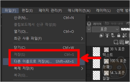 클립스튜디오에서 저장하는건 간단합니다. 파일 > 저장 (또는 다른 이름으로 저장)을 진행합니다. 저장 경로는 각자 알아서 지정합니다. 중요한건 저장된 클튜 파일이 아니라, 이렇게 저장하는 행위 자체입니다. 이 과정이 반드시 필요합니다.