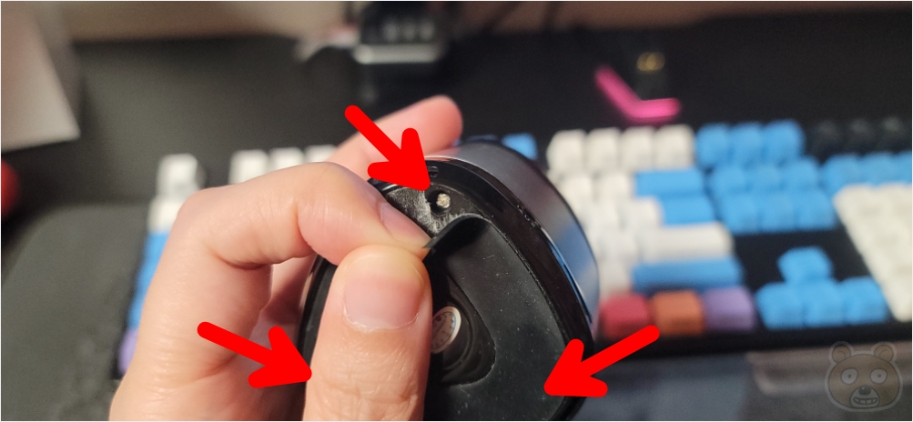 역시 예상대로 고무 패킹이 되어있는 부분을 들춰보니 안쪽에 나사가 채결되어 있음을 확인했습니다. 각 모서리 부분에 한 개가 있으니 삼각 기둥 형태의 제품이므로 각 모서리에 나사가 있겠죠? 즉 3개의 스크류를 풀어주면 됩니다. 정밀드라이버로 풀어줍니다.