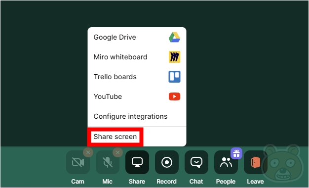 그러면 바로 위에 여러가지 메뉴가 뜨는데 버튼 바로 위에 보이는 Share screen 메뉴를 누릅니다.