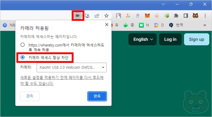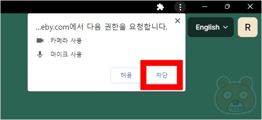 브라우저의 주소창 하단에 카메라 및 마이크에 대한 권한을 요청하는 창이 보일 것입니다. 사용 하시려면 허용을, 사용하지 않으려면 차단을 누르면 됩니다. 허용을 누르면 PC에 장착된 캠이 활성화 되고 마이크도 인식하게 됩니다. 이번에도 차단을 눌러 진행해 보겠습니다.