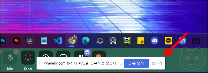 화면 공유가 시작되면 「whereby.com에서 내 화면을 공유하는 중입니다」 라는 안내문이 뜨는데 이건 그냥 숨기셔도 됩니다.