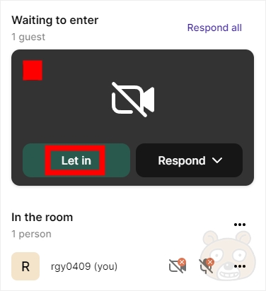 만약 지인이 정상적으로 방에 들어오게 되면 Waiting to enter 리스트에 해당 지인의 아이디명이 보일 것입니다. 호스트는 확인 완료 후 이상 없다면 Let in 버튼을 눌러 수락해주면 끝입니다.