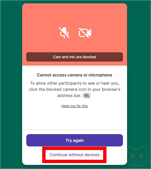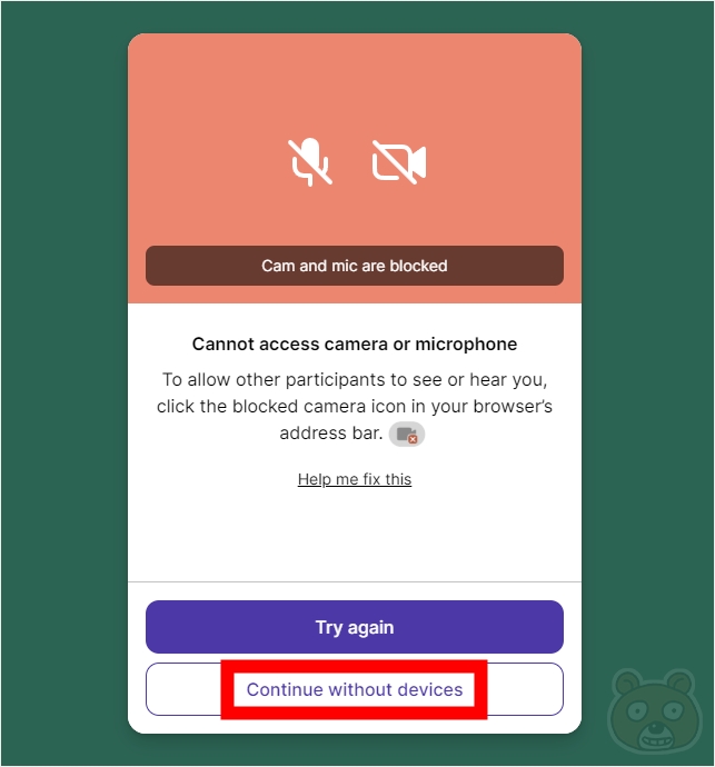 카메라와 마이크가 잠겼다는 내용의 안내문이 보이는군요. 상관 없으므로 Continue without devices 버튼을 누릅니다.