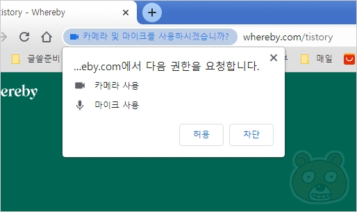 이후에 이런 안내창이 뜰 수도 있습니다. 카메라와 마이크 사용을 원하시면 허용을 누르면 됩니다. 저는 화면 공유가 목적이라 차단을 눌렀습니다.