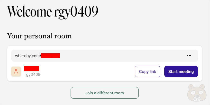 로그인 완료 후에는 기본 대시보드 화면으로 전환됩니다. 최초 실행 시에는 아무것도 개설되지 않은 기본 상태입니다. 저는 이미 만들어놓은 룸이 있어서 위의 이미지처럼 나오는데 여러분들께서는 최초 개설을 진행하시면 됩니다. 이미 등록된 URL의 경우에는 중복되었다고 나올 것입니다. 티스토리 개설과 비슷한 과정이므로 크게 어려운 부분은 없습니다. whereby.com/원하는주소 형태로 완성되므로 초대를 원하는 사람에게 URL 주소를 보내주시면 됩니다. Copy Link 버튼을 눌러도 됩니다. 웨얼바이 개인 주소가 개설 완료되었다면 Start meeting 버튼을 누릅니다.