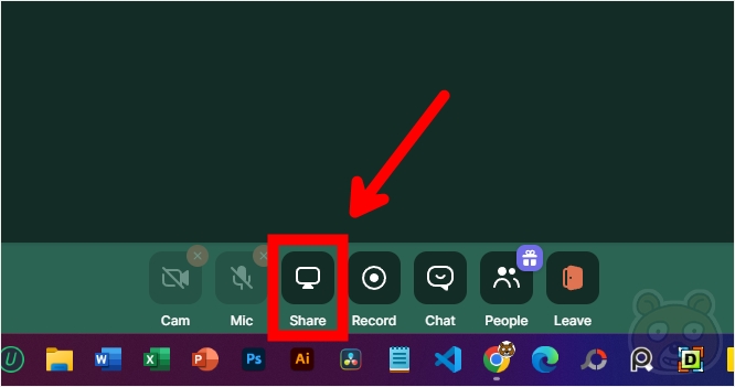 이제 호스트와 게스트가 모두 한 방에 입장한 상태입니다. 그러면 서로 화면 공유를 해 봅시다. 화면 하단에 보이는 Share 아이콘에 마우스를 올려봅니다.