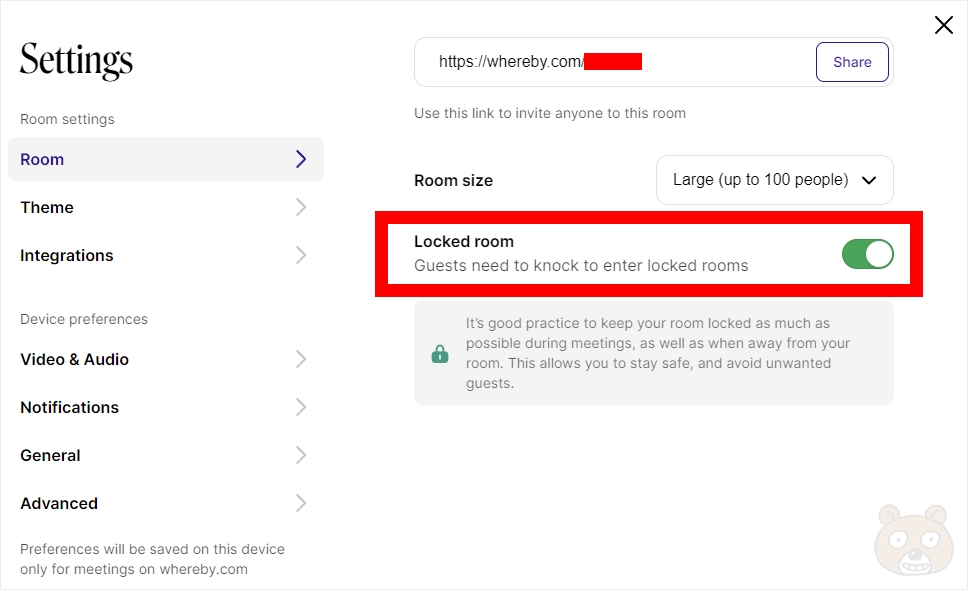 그러면 Settins 화면이 뜨는데 정면에 딱 보이는 Locked room 버튼을 켜고 끔으로서 공개 및 비공개 설정이 가능합니다. 쉽죠? 공개 모드가 되면 아무나 쉽게 들어오게 되고 비공개의 경우는 호스트가 수락을 해야만 화면 공유 방에 참여를 할 수 있게 됩니다.