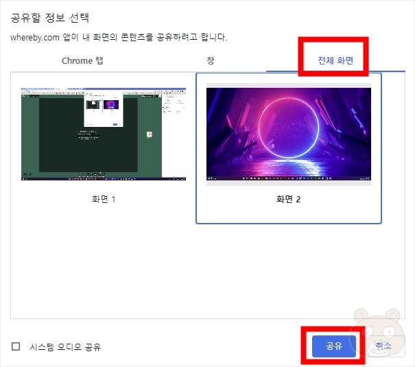 공유할 정보 선택 창이 뜹니다. 여기에서는 화면 전체를 공유해야 하므로 전체 화면 탭을 선택합니다. 제 경우는 듀얼 모니터를 쓰기에 화면1과 2가 목록으로 보이는 상황입니다. 만약 노트북의 경우라고 한다면 모니터가 1개 밖에 없으므로 화면 1만 나올 것입니다. 아무튼 원하는 화면을 선택하고 공유 버튼을 눌러주면 됩니다.