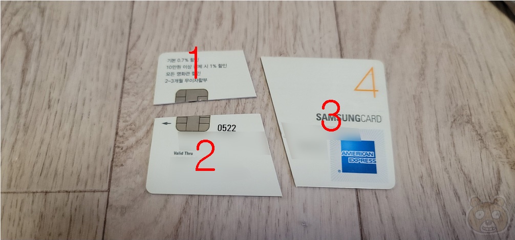 결국 제가 선택한 방법은 이것입니다. 이 방법은 가위만 있으면 됩니다. 가위로 카드를 3등분합니다. 카드를 비스듬하게 가운데를 자르고 IC칩이 있는 부분을 가로질러 한번 더 자릅니다. 그러면 위의 사진처럼 카드는 3분할 될 것입니다. 왼쪽 위를 1번, 그 아래쪽을 2번, 마지막 가장 큰 나머지 부분을 3번 영역이라고 하겠습니다.