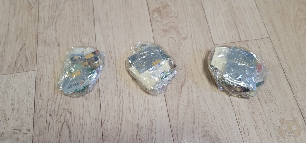 그리고 각 파츠(?)를 테이프로 잘 봉인합니다. 테이프로 감싸는 이유는 카드의 뾰족한 부분이 위험하게 작용할 수 있기 때문입니다. 이것들을 각자 일반쓰레기로 버립니다. 알아보니 플라스틱 카드는 일반 쓰레기로 분류가 된다는군요. 그럼 이것들을 한 개의 쓰레기봉지에 모두 버리느냐? 아니죠!