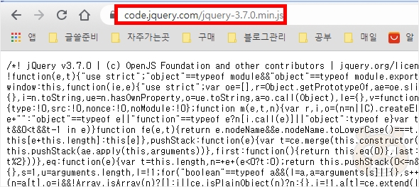 그런데 막상 클릭하면 파일이 다운로드가 되는게 아니고 압축된 코드가 잔뜩 보이게 될겁니다. 원래 그렇습니다. 당황하지 마시고 해당 브라우저의 URL 주소를 그대로 복사해서 사용하시면 됩니다.