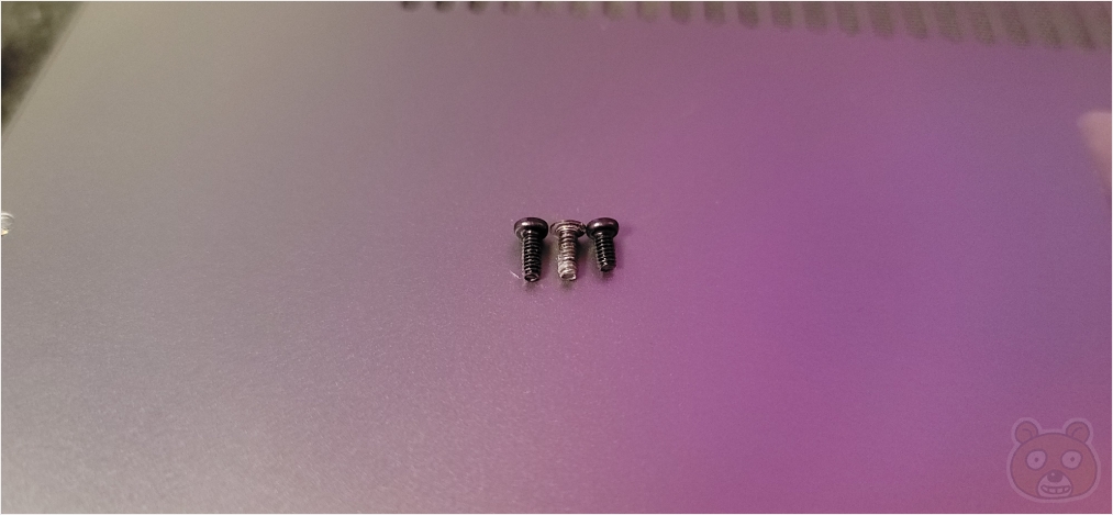 보시는 것처럼 크기가 약간씩 다릅니다. 맨 왼쪽은 2 x 5 mm 짜리 스크류, 맨 오른쪽은 2 x 4 mm 스크류입니다. 샤오미 노트북 나사 크기는 아마도 2 x 4.5 mm 정도 되는 것 같습니다. 그럼 이럴때는 어떤 녀석을 사용해야 할까요? 완벽한 정답은 없지만 저는 기존 크기보다 짧은 것을 사용해야 한다고 생각합니다.