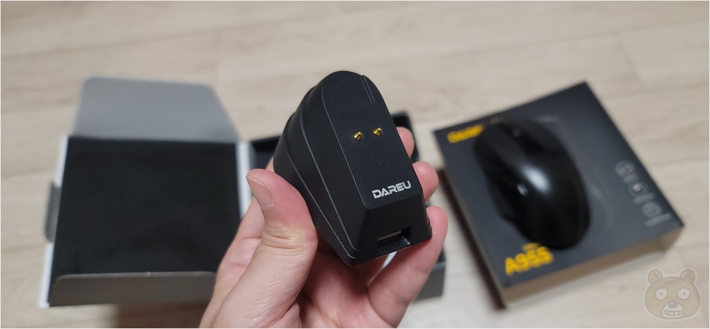 정면에서 볼 때 C타입 단자가 보입니다. 유선 모드로 사용하고자 할 때 이용하면 됩니다. 다얼유 A955 마우스는 보시다시피 비스듬한 스타일이라 손목의 부담을 최소화 했습니다. 다만 이렇게 비대칭인 경우에는 특정 손잡이 유저만을 위한 마우스가 되어버립니다. 다행히 저는 오른손잡이라 불편함이 없습니다.