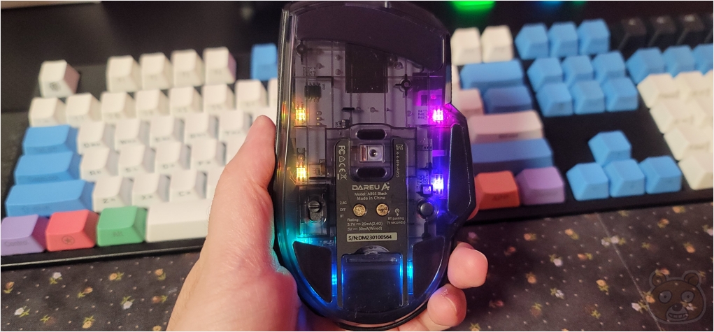 충전독을 PC에 잘 연결해줍니다. 그리고 A955 마우스 바닥에 위치한 아날로그 스위치를 2.4GHz 부분으로 옮기면 바로 전원이 들어옵니다. 바닥 부분도 투명 재질인데다 RGB LED가 들어오니 디스코장이 따로 없군요. 이뻐서 좋습니다.