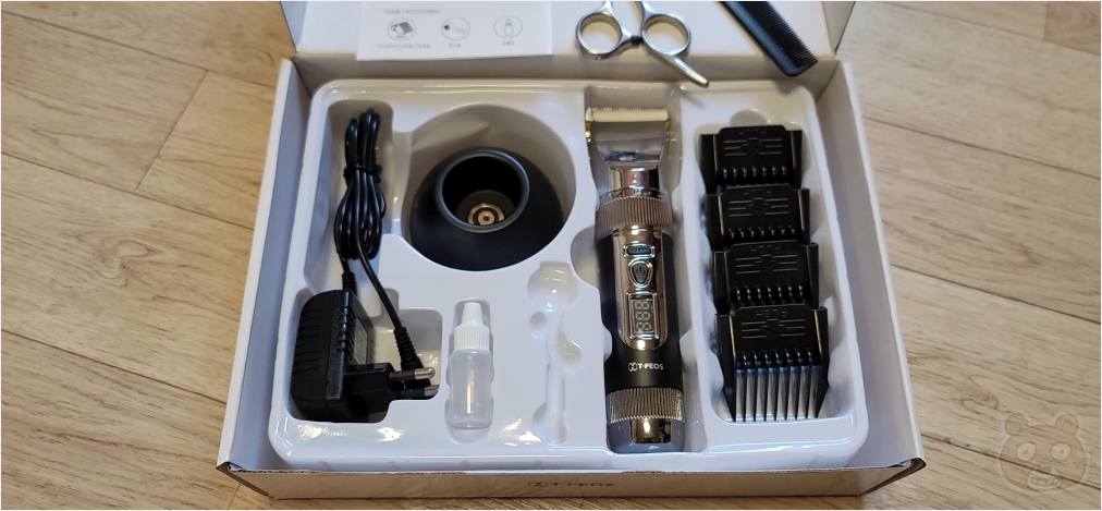 구성품입니다. 푸짐합니다. AC 어댑터, 충전독, 윤활유, 헤어 트리머, 각 mm 종류의 빗살캡, 그리고 서비스로 받은 숱치는 가위, 빗! 이렇게 구성된 바리깡입니다.