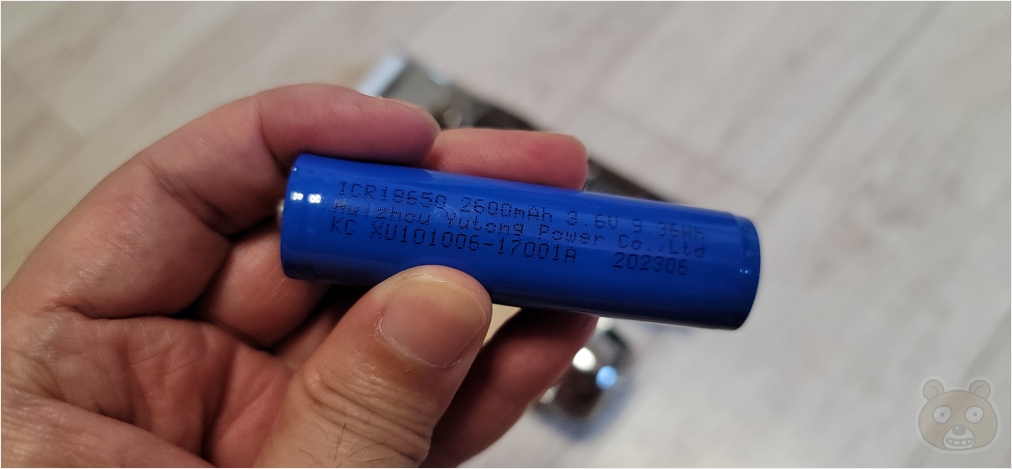 이렇게 18650 배터리가 1개 들어있습니다. 2,600mAh 짜리로군요. 분리형 배터리가 좋은 이유는 다름아닌 배터리 수명과 직결된 문제이기 때문입니다. 보통 충전형 배터리의 수명을 6개월, 길게는 1년으로 봅니다. 그말인즉슨 평균 수명 기간동안 충분히 사용한다면 이후에 고장날 확률도 높아진다는 뜻입니다. 충전이 잘 안 된다거나, 완충을 해도 금방 방전되는 현상이 나타나죠. 그럴때 18650 배터리를 별도로 새 제품을 구매해 바꿔서 장착하면 다시 처음의 쌩쌩했던 배터리로 바뀌는 것입니다. 이건 정말 사용자 배려를 확실히 고려한 부분이라고 봅니다.