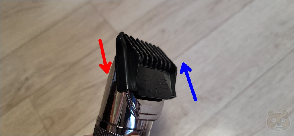빗살캡은 빨간색 방향으로 장착하고 분리할때는 파란색 화살표인 반대 방향으로 밀면 빠집니다.