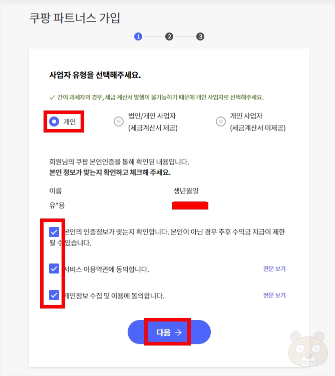 이제부터 쿠팡 파트너스 가입 과정입니다. 먼저 1단계입니다. 가장 먼저 만나는 화면은 위의 이미지와 같은 모습일 겁니다. 일단 개인이시면 개인에 체크를 합니다. 그리고 체크 항목이 3개가 있을텐데 모두 다 체크합니다. 체크하지 않으면 다음 과정으로 못 넘어가니까요. 다 완료했다면 다음 버튼을 누릅니다.