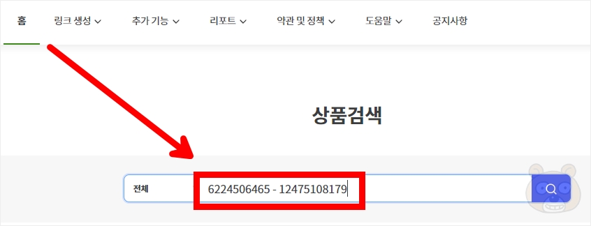 이제 쿠팡 파트너스로 넘어와서 상품검색란에 방금 복사한 상품번호를 붙여넣기하고 검색합니다.