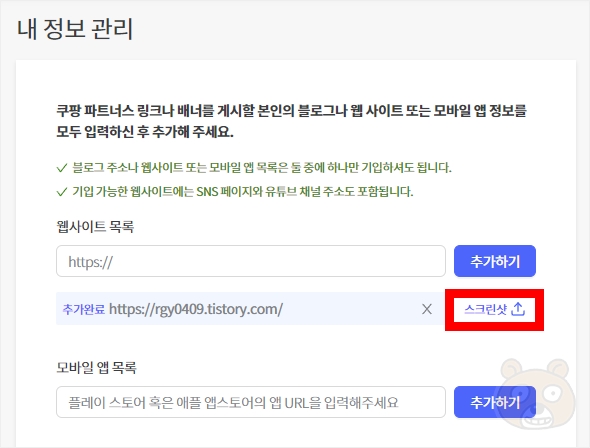추가 완료된 URL 오른쪽에 보시면 스크린샷 버튼이 있습니다. 눌러서 방금 저장한 스크린샷 이미지 파일을 업로드해 줍니다. 여기까지 해야 완벽한 쿠팡 파트너스 가입 방법이 마무리가 됩니다.