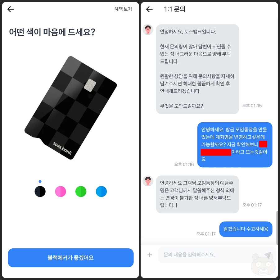 모임통장 입출금 전용 카드도 제공되는군요. 전 세계 상위 0.1%만 사용한다는 블랙 리치카드가 생각나서 블랙 색상으로 선택했습니다. 근데 모임통장 계좌명이 제 이름과 괄호 안에 모임통장이라는 명칭으로 설정되어 있어서 혹시 모임명으로 따로 추가 변경이 되는지 챗 상담으로 물어봤는데 그건 불가능한 모양이더라고요. 아쉬웠습니다. 아무래도 이런 명칭을 변경할 수 없는 이유는 분명 누군가가 악용해서 사기치는 일이 발생할 수 있으니 그런 것이겠지요? 아무튼 생각보다 쉽게 토스 모임통장을 개설했습니다. 카드 실물은 과연 얼마나 이쁠까요? 기대됩니다.