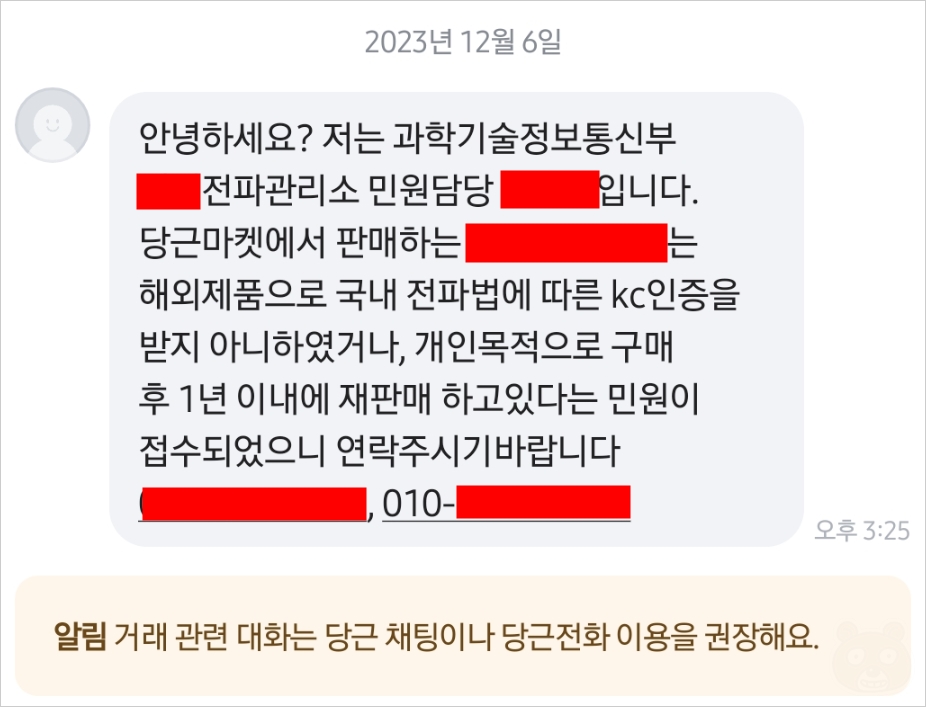 안녕하세요? 저는 과학기술정보통신부 ㅇㅇ전파관리소 민원담당 ㅇㅇㅇ 입니다. 당근마켓에서 판매하는 ㅇㅇㅇ 제품은 해외제품으로 국내 전파법에 따른 KC인증을 받지 아니하였거나, 개인목적으로 구매 후 1년 이내에 재판매 하고 있다는 민원이 접수되었으니 연락주시기 바랍니다.