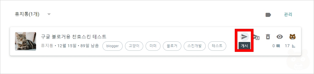 그러면 이렇게 휴지통에 보관된 글 목록을 살펴볼 수 있습니다. 다시 공개로 전환하고 싶다면 공개 전환을 원하는 글에 마우스를 올리고 게시 아이콘을 눌러주면 끝입니다. 간단하죠? 끝.