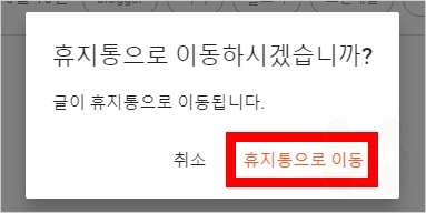 그러면 이렇게 휴지통으로 이동하겠냐는 안내창이 뜰겁니다. 당연히 그럴 것이니 휴지통으로 이동 버튼을 눌러줍니다. 그러면 해당 글은 목록에서 빠지게 됩니다.