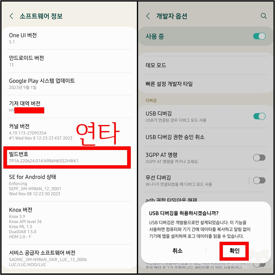 빌드번호에서 최소 7번 연속 터치를 빠르게 하면 카운트가 되면서 개발자 모드가 활성화됩니다. 활성화가 되었다는 안내문이 나오면 설정 > (맨 아래) 개발자 옵션 > USB 디버깅을 활성화하면 됩니다.