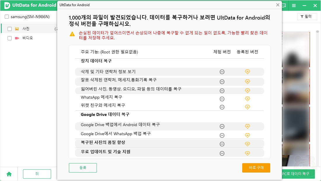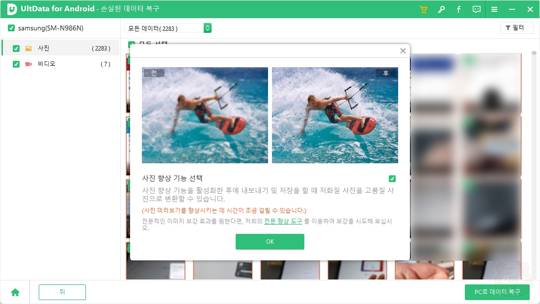 테너쉐어 얼트데이터 프로그램은 복구 시에는 유료 결제를 해야만 합니다. 복구 전에 사진 향상 기능을 선택할 수 있는데 당연히 체크를 해야 고화질 원본 파일을 복구할 가능성이 높습니다. 아! 중요한 것! 모든 프로그램은 복구율이 100%가 안 됩니다. 이 점을 명심해 주시기 바랍니다. 100% 모두 복구된다고 하는 프로그램은 수상한 녀석이니 오히려 조심해야 합니다. 이건 한국 최고의 복구 업체인 명정보시스템을 가도 마찬가지입니다. 잘 기억해 주세요.