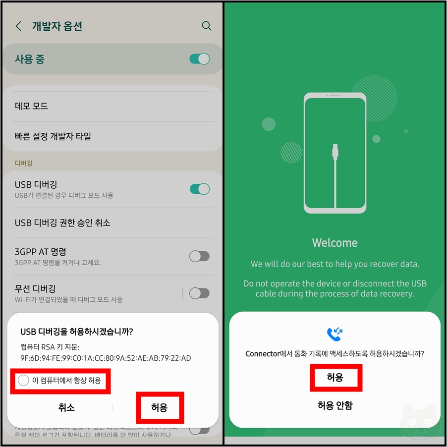 USB 디버깅을 허용할지에 대한 안내창이 뜨면 당연히 허용을 터치합니다. 이 컴퓨터에서 항상 허용에 체크해 두시면 앞으로 지금 연결하는 PC에서는 따로 추가 설정을 할 필요가 없어집니다. 물론 해당 PC를 포맷하면 싹 다 초기화 되지만요. 그리고 스마트폰에서는 Welcome 이라고 표기된 초록색 화면에 권한 허용창이 뜰 때가 있는데 이건 다음 과정에서 다시 설명드리겠습니다.