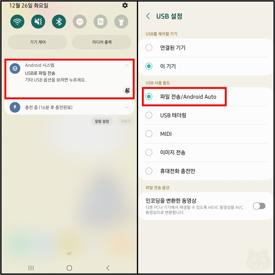 PC와 데이터 케이블로 유선 연결을 하면 갤럭시 알림창에 바로 안드로이드 시스템 관련 알림이 뜹니다. 터치해서 USB 사용 용도를 파일 전송 관련으로 변경합니다. 아마 기본으로 파일전송이 선택되어 있을 겁니다.