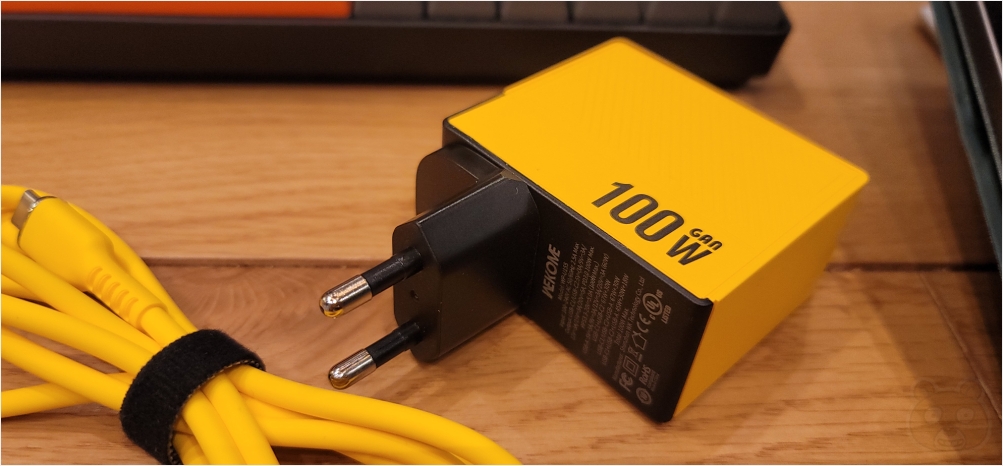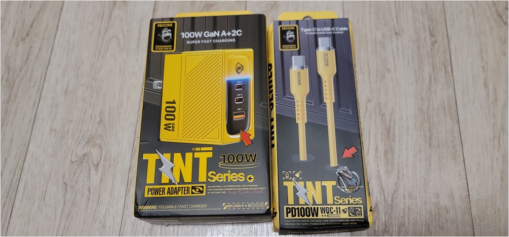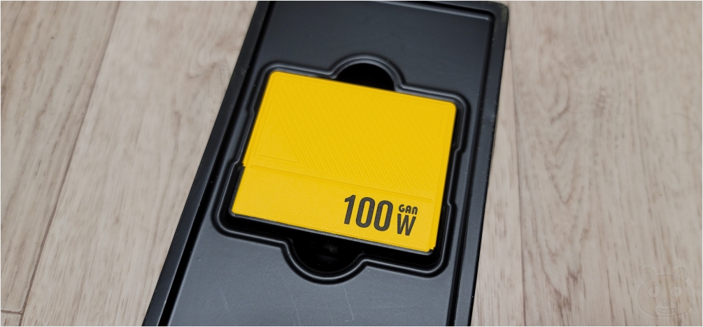 바로 박스 개봉! 아아아~ 역시 구매하길 잘했다는 생각이 바로 다시 듭니다. 너무 이쁘지 않습니까? 역시 GaN 100W PD충전기는 노란색이 국룰인 것 같습니다. 정말 잘 어울려요! 100W GAN 이라는 폰트가 한 눈에 쏘옥 들어옵니다.