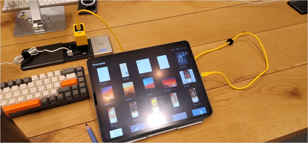 아직은 한국형 플러그가 오지 않아서 일단은 샤오미 멀티콘센트에 연결을 해서 충전을 시도해 봅니다. 역시 잘 됩니다. 초고속충전, 고속충전, PD충전 모두 다 잘 됩니다. 아이패드, 노트북 가릴 것 없이 몽땅 다 충전 가능합니다. 당연한 결과겠죠? 전용 케이블도 너무 잘 어울립니다. 역시 충전기 노란색은 못 참는 것이었습니다. 이렇게나 찰떡 컬러인데 말이죠!