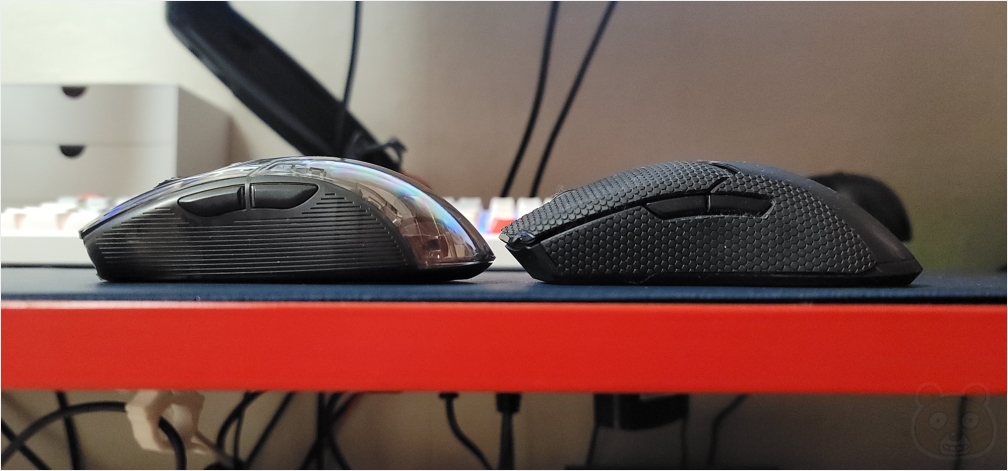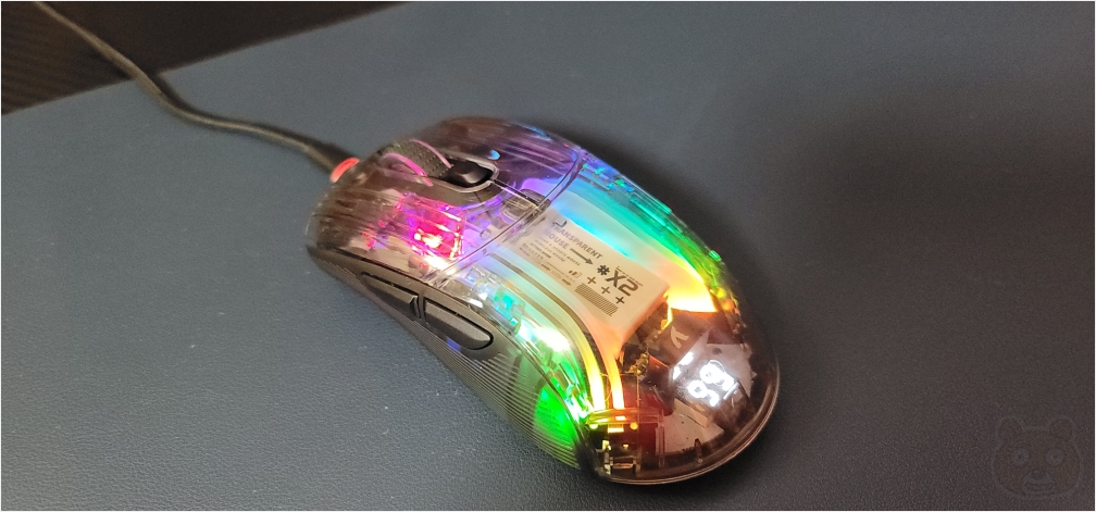 측면 모습입니다. 정말 유사합니다. 벤치마킹을 바이퍼 얼티메이트로 한건 아닐까 의심이 될 정도입니다. 뭐 근데 대부분의 마우스가 이런 형태이긴 하지만요. 아무튼 그립감은 괜찮다는 것! 다만 너무 맨들맨들한 느낌이라서 한 여름에는 손에 땀이 찰 것 같기도 합니다. 대신 청소는 그만큼 편리하겠지만요. 100% 투명한 재질이 아니어서 RGB 광량이 적당히 뿜어져 나옵니다.