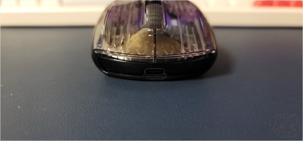마우스 앞 부분에 충전겸 유선 모드로 사용 가능한 C타입 단자가 위치해 있고요.