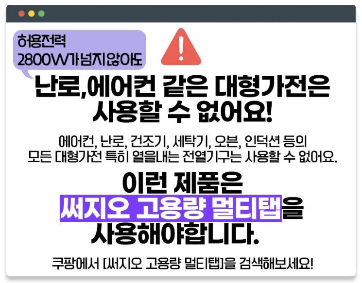 이건 써지오 멀티탭 뿐만 아닙니다. 대부분의 멀티탭은 고출력 고용량 가전제품을 사용함에 있어서 부담이 있어요. 에어컨, 난로, 건조기, 세탁기, 오븐, 인덕션 등등은 고출력 가전제품입니다. 그러므로 소형 가전용으로 사용해 주시는게 가장 안전합니다.