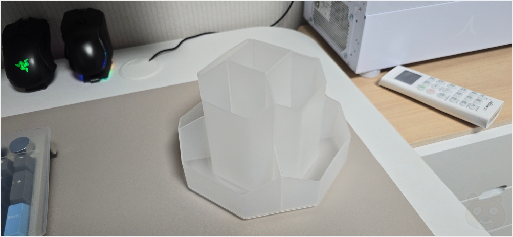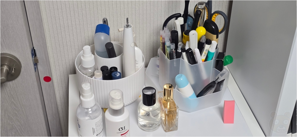 그리고 회전식 보관함! 여기에는 각종 볼펜 및 커터칼, 가위, 드라이버, 헤라, 송장지우개, 기타 등등등 다양한 생필품들이 꽂혀 있습니다. 너무 유익합니다. 이번에 구매한 보관함들은 너무 잘 구매했습니다. 다 제 값어치를 하고 있습니다. 훌륭하군요. 모두 추천드리는 보관함입니다. 끝.