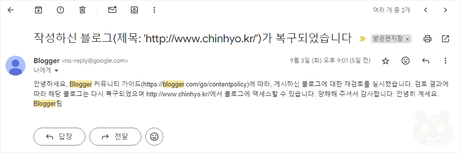 근데 생각보다 결과는 빨리 도착했습니다. 다행히 복구가 되었어요! 와... 진짜 다행이었습니다. 아니 근데 끝까지 이유를 안 알려주네요? 그도 그럴것이 만약 정확한 이유를 알려주면 분명 그 방법을 우회하여 악용하는 악의 세력이 반드시 나타날 것이기에 그래서 일부러 정확한 원인을 안내해주지 않는것도 있을겁니다. 티스토리에서도 이와 같은 방침으로 운영하고 있고요. 여전히 저는 정확한 원인은 모른채 이번 에피소드를 마무리 하게 되었습니다.