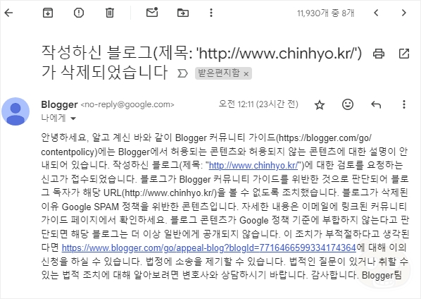 이렇게 시작된 저의 구글 블로그 여정! 블로그 자체가 삭제되었다는 엄청난 내용을 담은 지메일! 이럴 줄 몰랐습니다. 네이버 블로그나 티스토리는 양반이구나~ 라는 생각이 저절로 들더라고요. Google SPAM 정책을 위반했다는 내용입니다. 대체 뭘 위반한거죠?!
