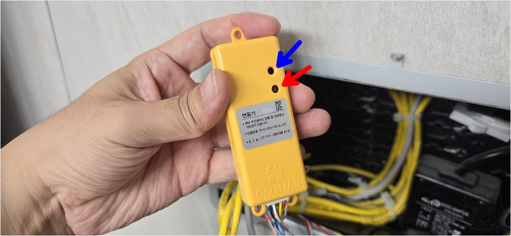 우리의 목표는 연동기의 버튼만 누르면 되는 것이기 때문입니다. 보시면 파란색 화살표가 가리키는 부분은 동작 LED 입니다. 빨간색은 연동 버튼이고요. 따라서 우리가 조작할건 연동 버튼 뿐입니다. 이 연동 버튼을 잠시 후 3초간 눌러줄 겁니다. 일단 알고만 계시고 잠시 안전하게 월패드에 거치 후 다시 게이트맨 도어락으로 가세요. 이제 도어락에서 아래의 콤보를 입력해 주시기 바랍니다.