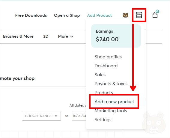크리에이티브 마켓에 로그인 완료 후 우측 상단에 보시면 상점 모양 아이콘이 있습니다. 클릭 후 Add a new product 로 들어갑니다.