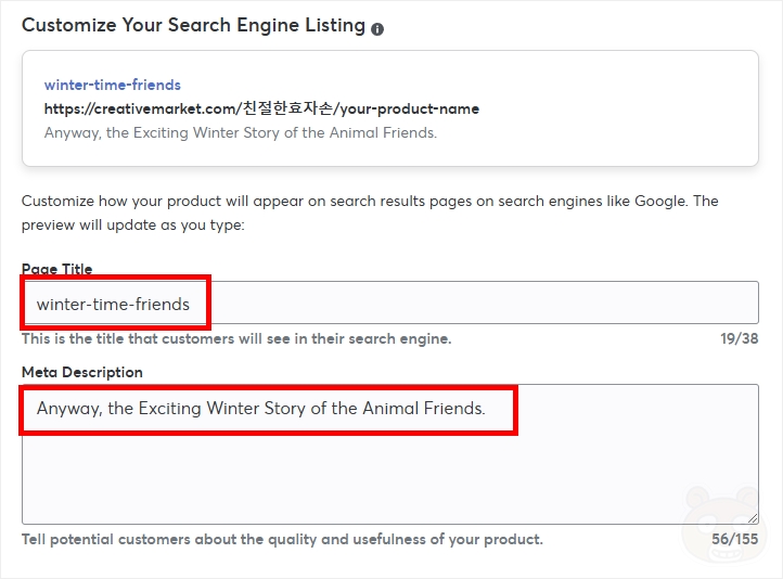 다음은 서치 엔진 수정인데 이건 꼭 해야 하는건 아니지만 그래도 해두면 URL을 직접 설정할 수 있어서 뭔가 URL 기억에 있어서 유리하다는 장점이 있습니다. 메타 설명은 그냥 대~충 입력해 두시면 됩니다.