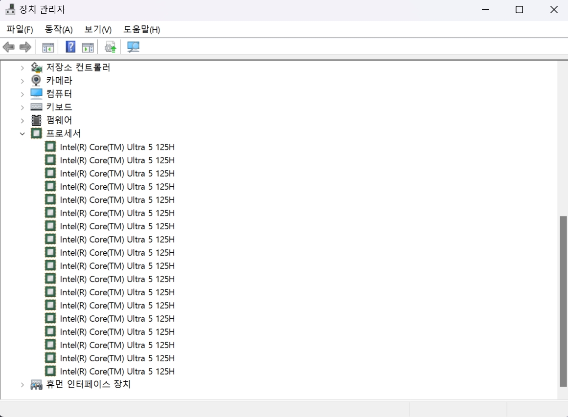 장치 관리자에서 프로세서 상황을 체크해 보았습니다. 코어 개수가 무려 18개나 됩니다.
