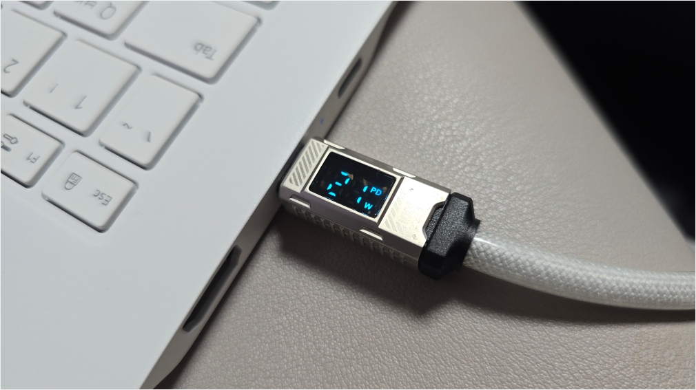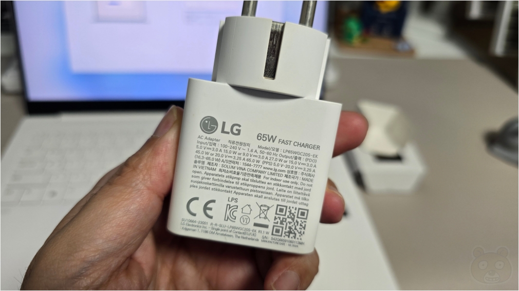 충전기는 65W를 지원합니다. 이거 하나로 노트북뿐만 아니라 지금 쓰고 있는 스마트폰도 충전할 수 있어요. C타입 충전을 지원하는 디바이스는 싹 다 충전 가능!