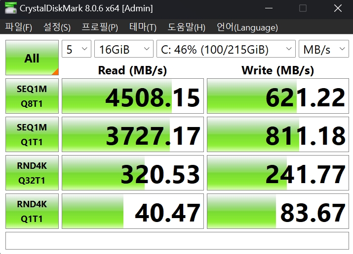 SSD 속도 테스트나 한번 해볼까 싶어서 크리스털디스크인포로 돌려보는데 쓰기 속도가 이상합니다. 오류인가 싶어서 다시 테스트해도 동일했습니다. 이와 관련된 내용을 찾아보니 이게 원래 이런 것이라는 이야기가 있더라고요. 16 Z90 SP-GA5 CK 안에 장착된 SSD는 SK하이닉스 제품이며 P41의 OEM 버전입니다. 속도가 썩 좋지 못해요. PCIe 4.0을 지원하면서 속도를 반 밖에 못 쓰다니!? 그리고 아무리 반 속도라도 지금 순차적 쓰기 속도가 (SEQ1 M Q8 T1) 1,000 mps도 안 나오는 건 뭔가 문제가 있는 상황이라는 판단입니다.
