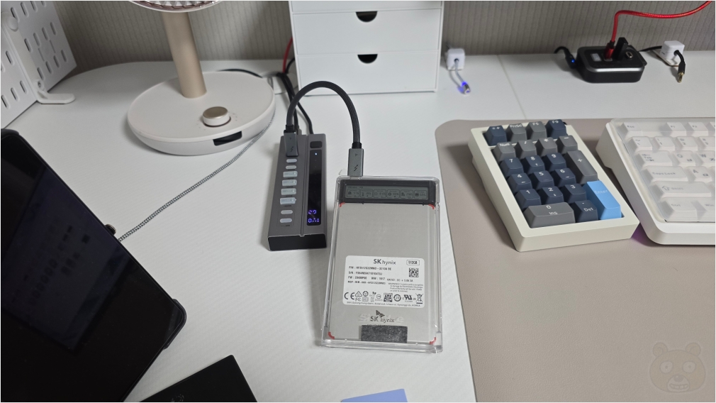 좋습니다. 이제 장착했으니 PC에 연결해서 정상적으로 인식하는지 살펴볼 것입니다. 참고로 연결한 저 USB 허브, 진짜 강추합니다. 성능이 매우 좋습니다.