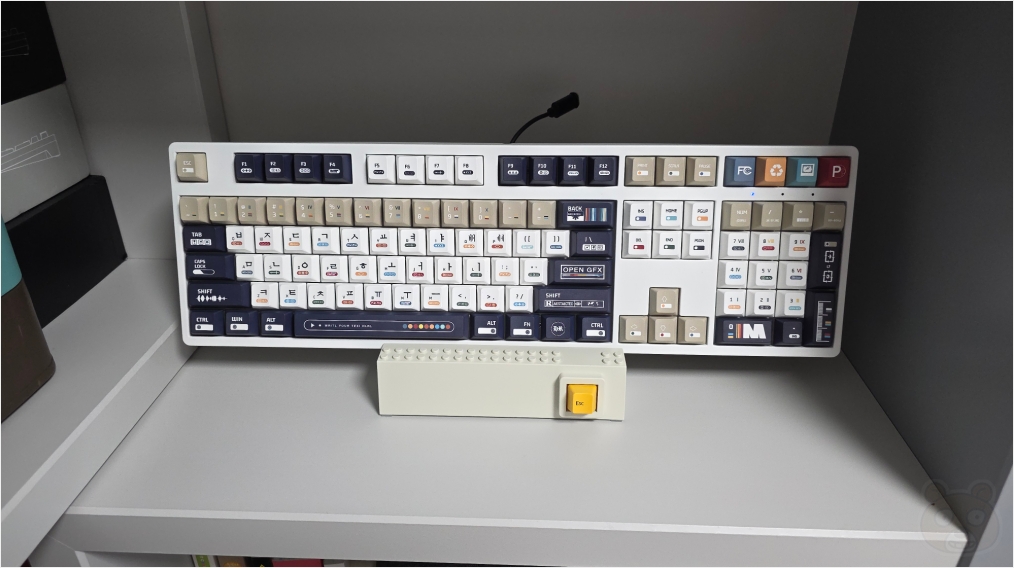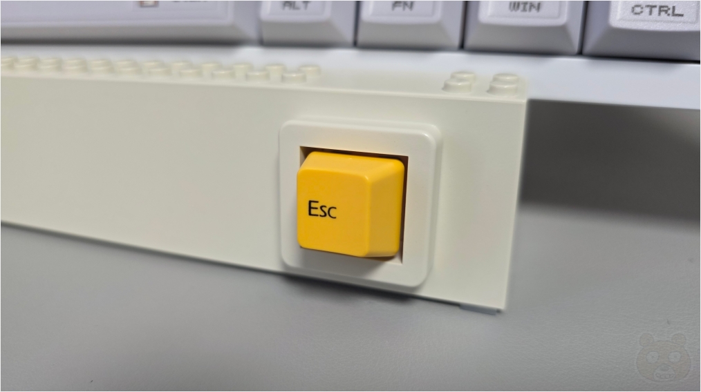 아니면 이렇게 일반적인 키캡을 써도 좋을 것 같고요. 기왕이면 특수 키캡을 사용하는게 좋겠다는 생각이 들어요. 그나마 평범하다고 판단되는 ESC 키캡을 사용해 보았습니다. 노란색 키캡도 잘 어울리네요. 핑크색 키캡을 써도 이쁠 것 같습니다.