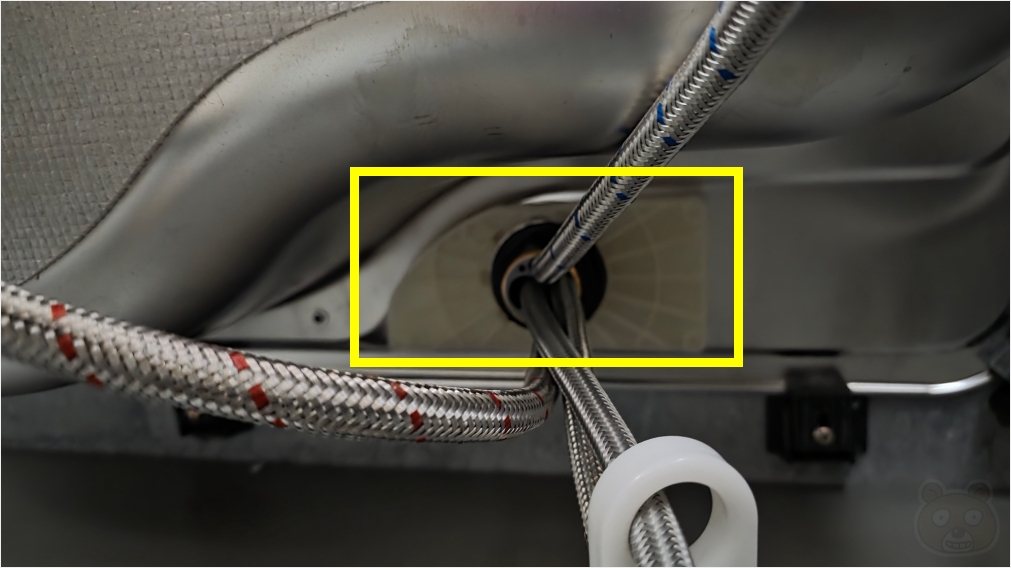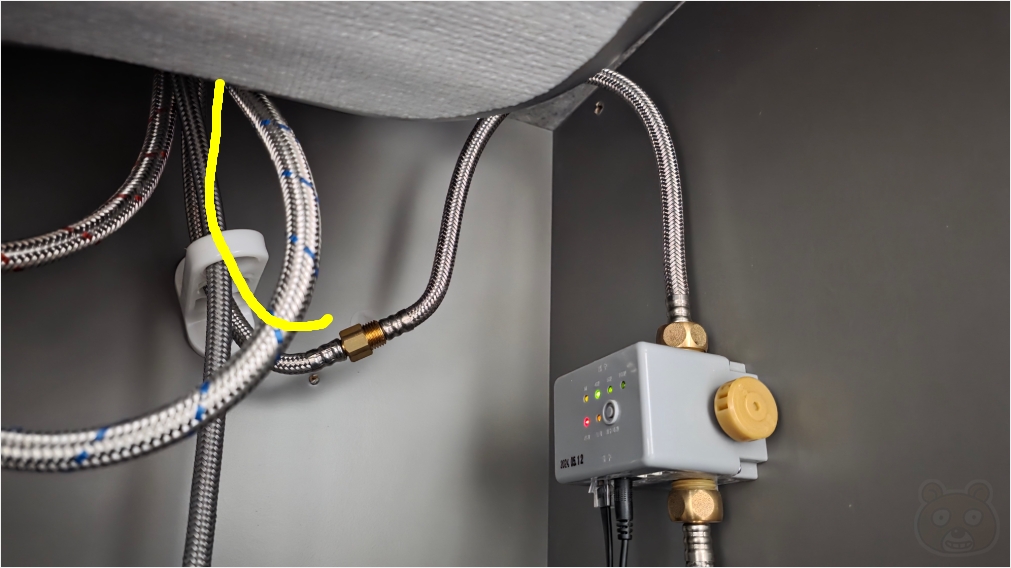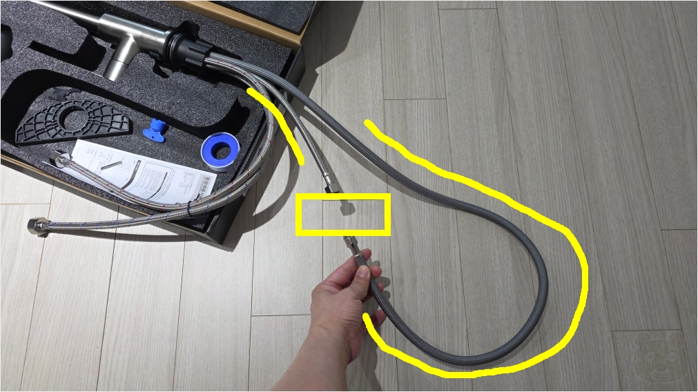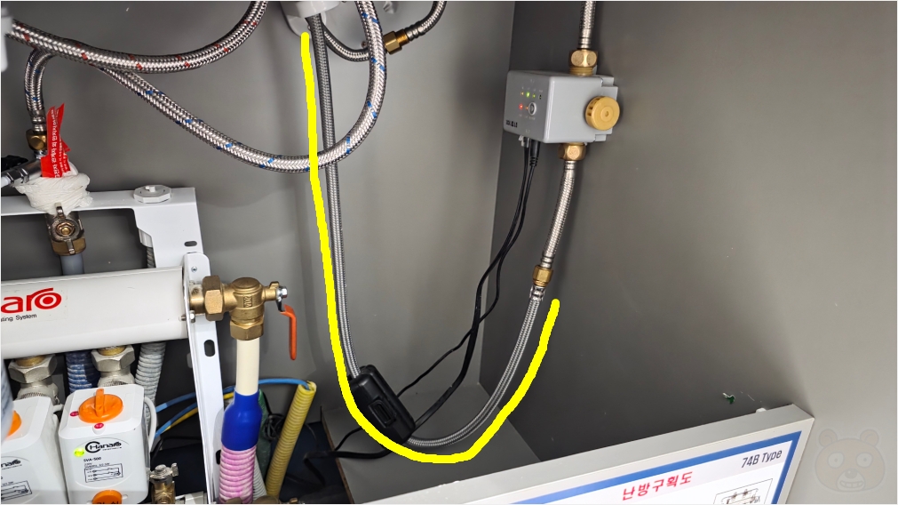 자, 파란색, 빨간색 호수는 알겠는데 이제 나머지 라인인 짧은 호수와 긴 호수는 어디에 연결을 하면 될까요? 그렇습니다. 아까 보여드렸던 센서 라인과 연결을 하면 되는 것입니다. 긴 호수가 바로 수전 헤드와 연결되어 있는데 늘어났다가 줄어들었다가 할 수 있는 이유는 이 긴 라인에 무게추를 설치하기 때문입니다. 참고로 짧은 호수에서 긴 호수로 물이 흐르는 구조입니다. 중간의 저 노란색 네모 부분에 절수패달 센서 기기가 들어가있는 것입니다.